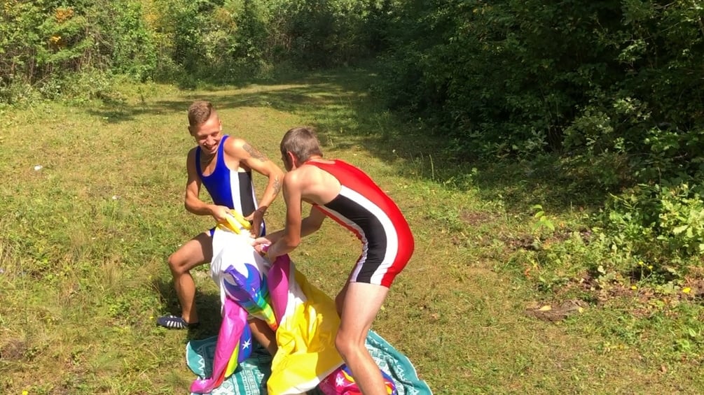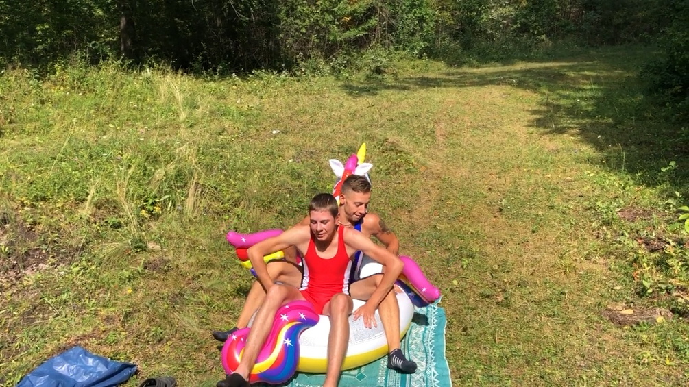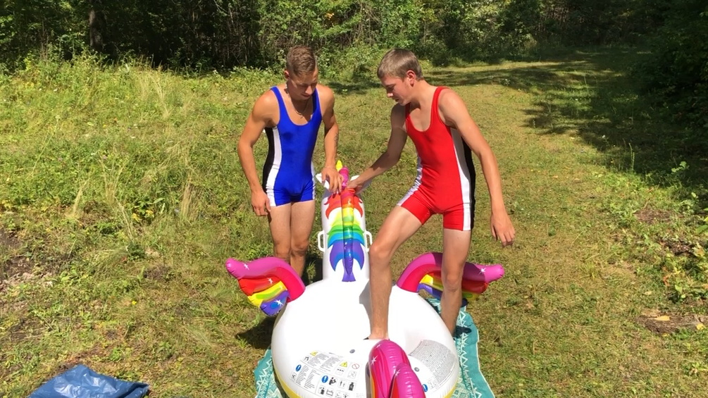 Frank and Jason stomp to pop big inflatable unicorn